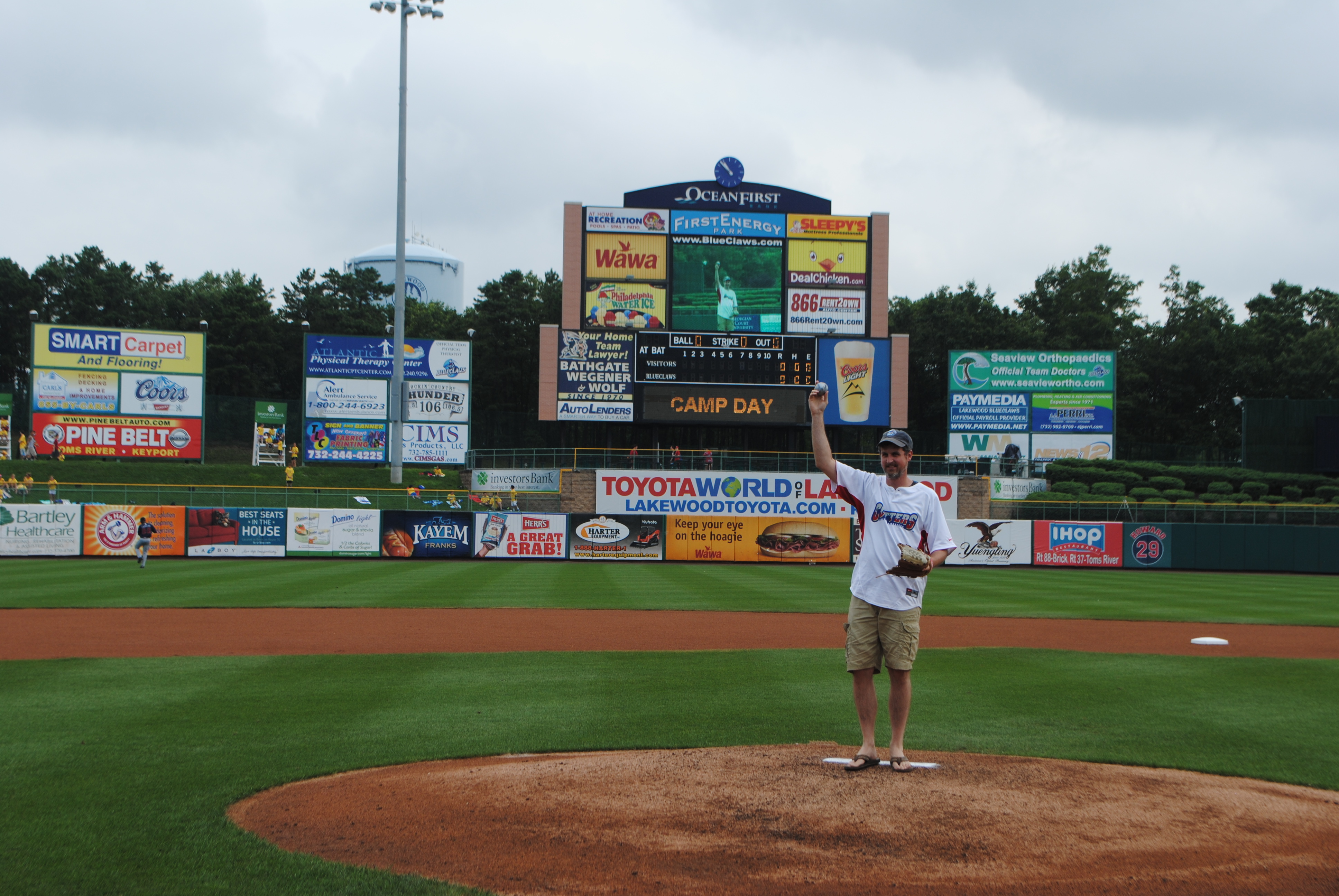 DSC_0422 Published July 12, 2013 at 3872 × 2592 in First Pitches at Lakewood ← Previous Next → Jason holds up his ball…photo credit: Dave Schofield